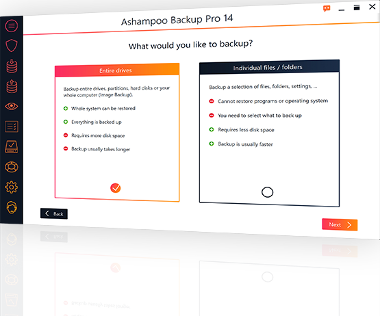 The new Ashampoo® Backup Pro 15 offers you all possible storage options: Back up single files to entire partitions to local drives or online storage providers. In addition, the program is light on resources, gets out of your way and does all the heavy lifting in the background.
