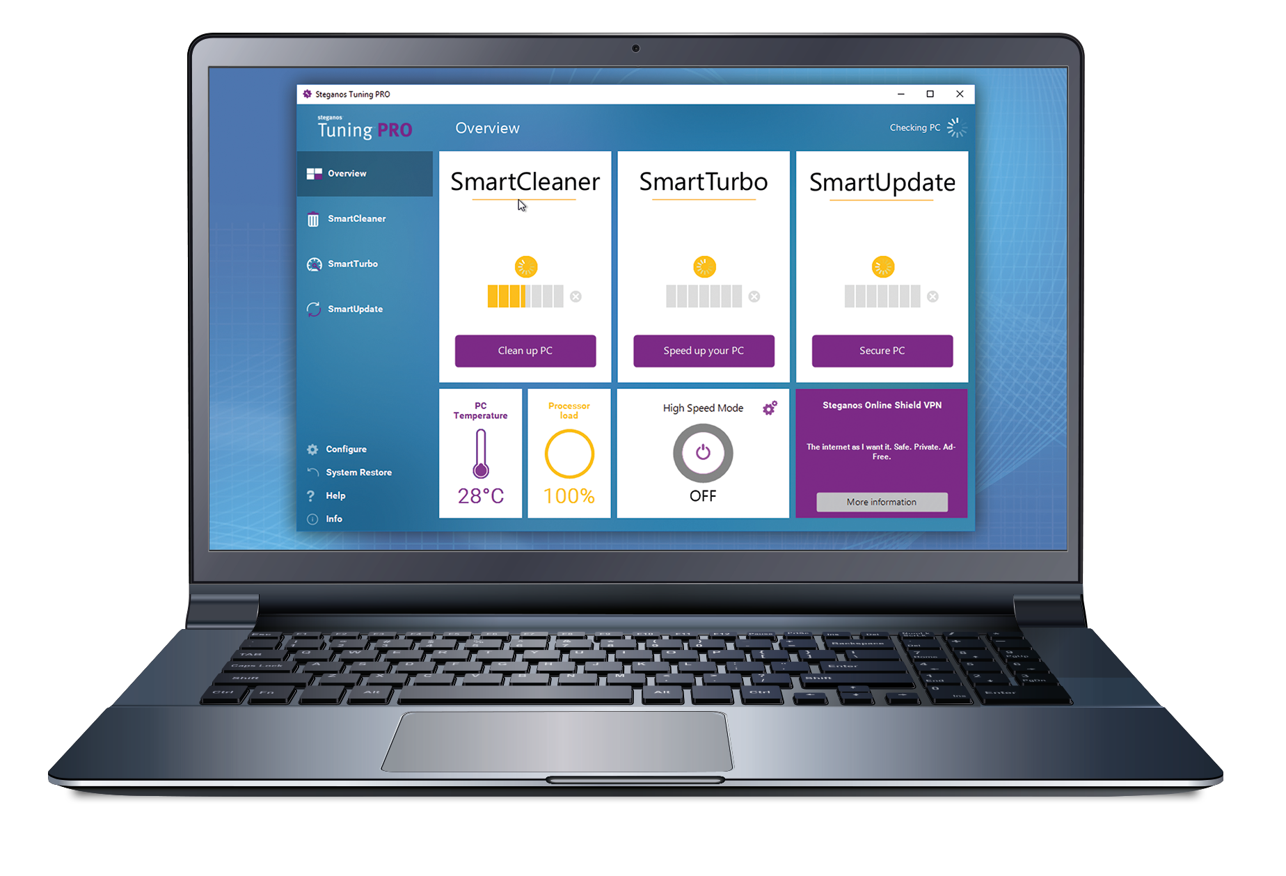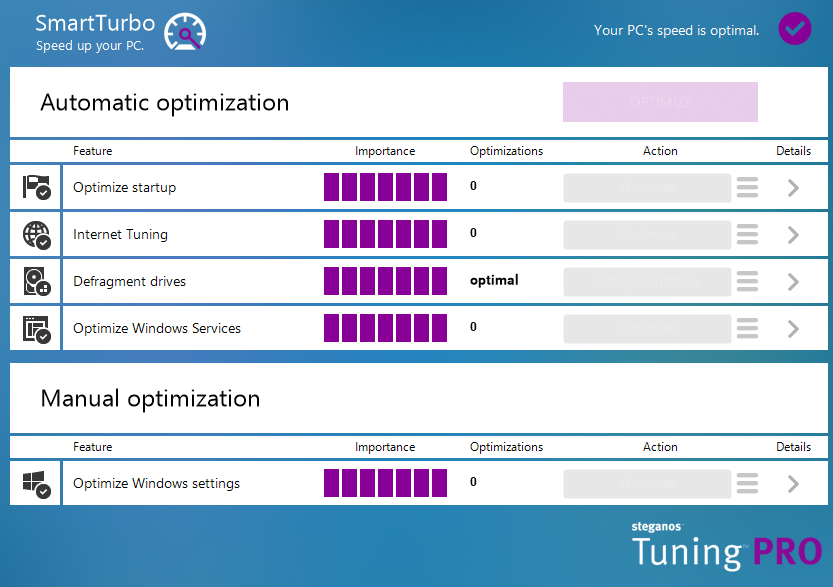 Steganos Tuning PRO closes security holes by providing the latest patches and updates for your programs. The automatic download of drivers leads to maximised speed and reliability (ATI, NVIDIA, Intel, etc.).