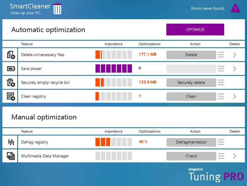 Windows Registry cleaning: A well kept error-free Windows Registry leads to a more stable PC. SmartCleaner repairs your Windows Registry, safe and reliably.